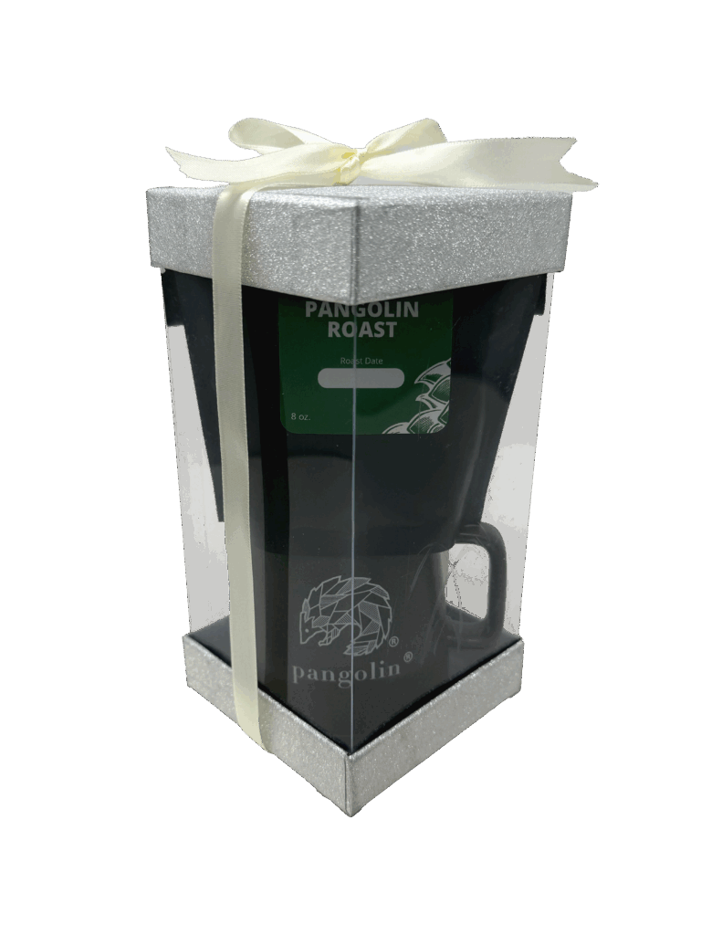 4oz Pangolin roast whole bean coffee and a black Pangolin mug.