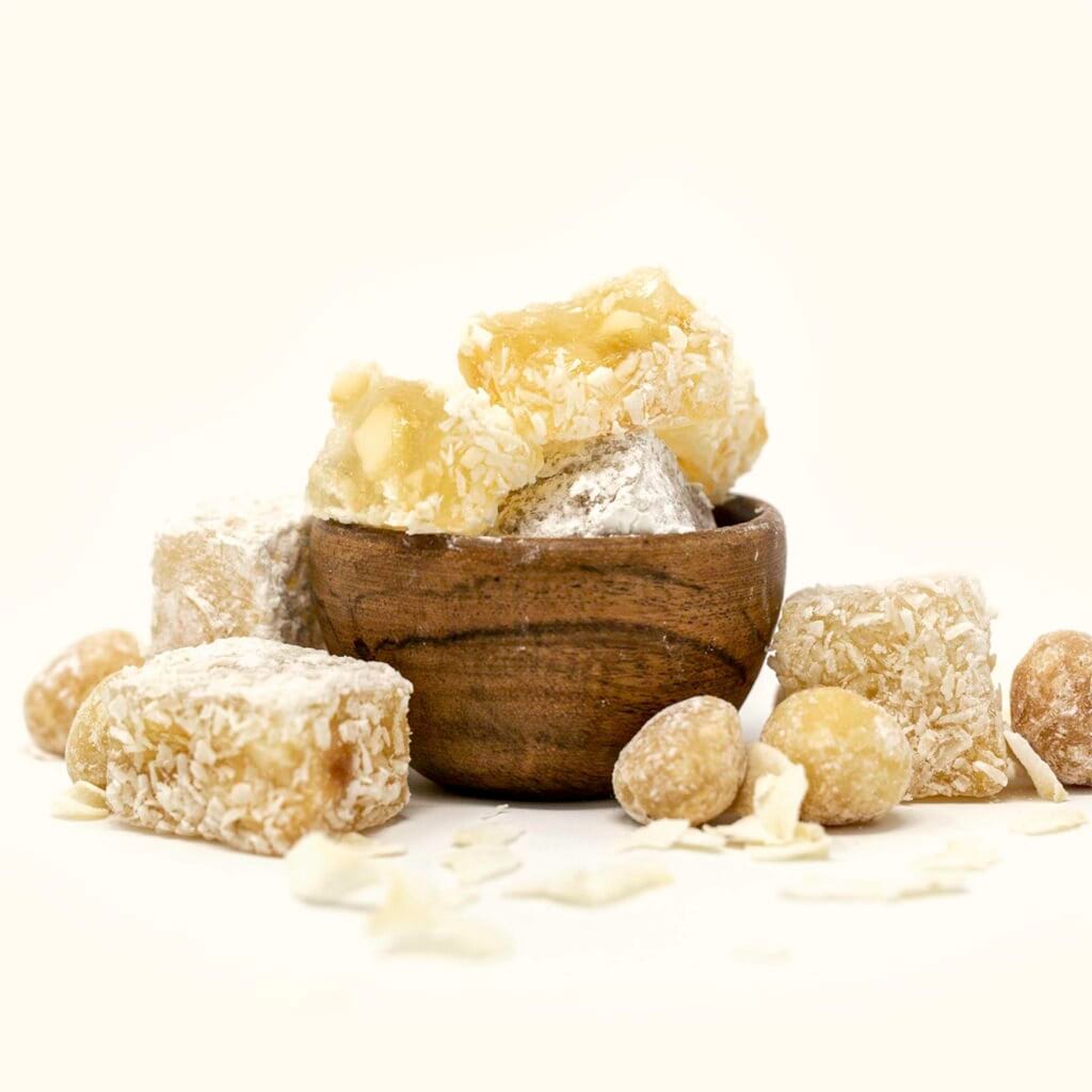 Creamy and salty macadamia nut pieces combine with a shredded coconut coating to give this delight a Hawaiian vibe. Get a taste of the island life sans the 14 day quarantine.